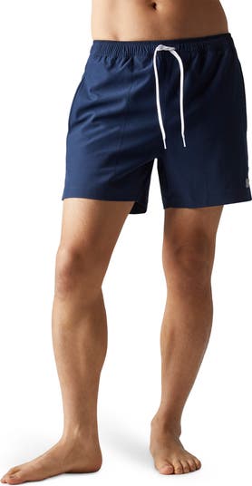 Stretchy, water-repellent fabric keeps you all-activity comfortable in swim trunks fitted with handy pockets and interior mesh shorts that keep odors at bay.