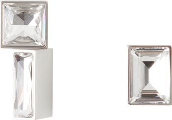 The Rythmique earrings play on asymmetry by offering a set of two different loops. The first is a single rectangular crystal, while the second is composed of two crystals of different sizes, a square one and a rectangular one. The overall look is resolutely modern, with an elegant, minimalist spirit.