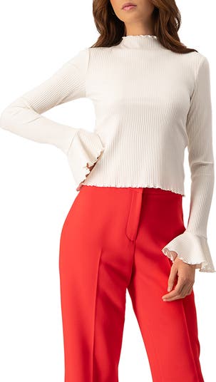 - A fitted ribbed top in a vibrant red hue, designed with long sleeves and playful flared cuffs. The subtle lettuce-edge hemline adds a feminine finish
