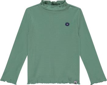 This ribbed long sleeve top features a mock neck complimented by lettuce edge detailing and a little patch toward the left shoulder.