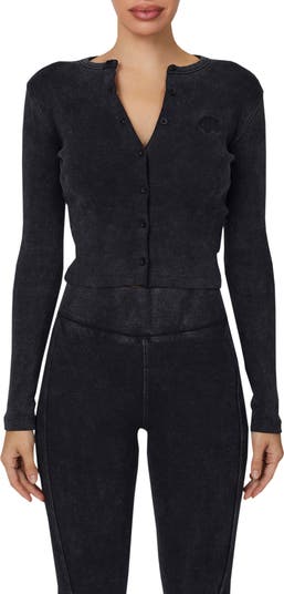 - Ribbed Vintage Brown Buttoned Long Sleeve T-shirt