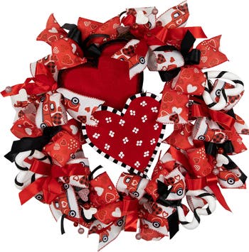Celebrate love with our charming Valentine s Day wreath. Crafted with care, this twig wreath is adorned with a delightful mix of red, white, and black ribbons, creating a festive and romantic atmosphere. Glittered hearts and berries add a touch of sparkle, while the centerpiece features two wooden heart insets, symbolizing the connection of hearts on this special day. Add a touch of love to your space with this heartwarming wreath. Product Features: Valentine s Day twig wreath Decorated with red, white and black ribbons Accented with glittered hearts and berries The center showcases 2 wooden heart insets Twig frame backing No assembly required – wreath comes in 1 piece Comes with a plastic loop for hanging Recommended for indoor use - if using outdoors place under a covered area Dimensions: 17” diameter (measured from outermost tip/edge to outermost tip/edge across the wreath) Material(s): polyester/plastic/foam/wood/twig