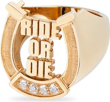 A bold horseshoe silhouette and gleaming white diamonds define this statement ring handcrafted in 18-karat gold with true ride-or-die character.