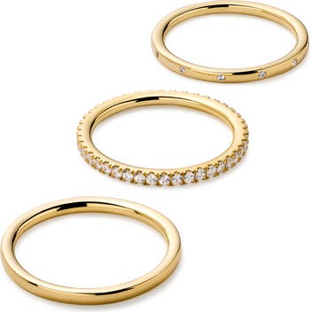 Stacked to perfection, this ring set is about to be your new favorite trio. Plated in 14k gold, this set features three sleek rings finished with cubic zirconia gems for a touch of sparkle. This versatile set can be worn stacked or sprinkled throughout your look on your favorite fingers, either way it’s destined to look good. If you’re in the mood for even more sparkle, we’d recommend styling this set with our Toda hoops.