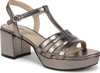 A chunky platform and block heel bring stylish height to a strappy sandal furnished with a cushioned footbed and flexible traction sole.