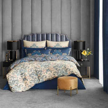 - The set is reversible: the same stylized pattern is repeated on the back of the pillowcases and duvet cover however the background now is of cool sand shade.