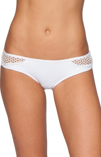 Mesh insets on the sides offer a glimpse of skin on versatile bikini bottoms with a trend-right hipster fit.