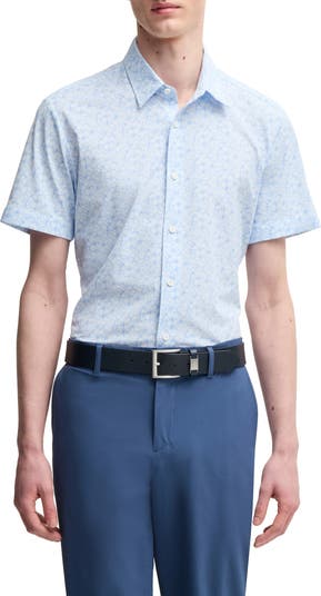 Gatthered flowers invite sunny breezes in a shirt that resists wrinkles and gives you plenty of stretch for moving or relaxing.