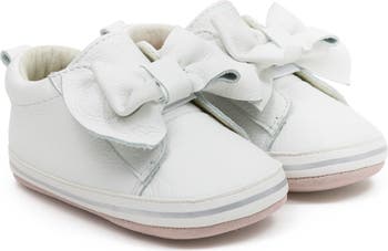 Soft leather and a floppy bow blend sophistication and charm in this cozy baby bootie with a cushy footbed and soft, flexible outsole perfect for wiggly toes.