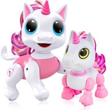 1 ORIGINAL ROBO PET UNICORN + 1 MINI UNICORN ROBOT: The Robo Pets Unicorn toys pack comes with the original Robo Pet Unicorn interactive smart robot plus a mini automated unicorn robot. This unicorn robot STEM toys set grows with developmental skills from simple instructions for little ones to advanced motor skill gestures for older kids INTERACTIVE STEM UNICORN PLAY MODES: The original Robo Pet Unicorn has a lot of moves up its hooves! Guide this robot unicorn with simple hand motions in Gesture Mode, watch your unicorn toy navigate a room all on its own in Adventure Mode, or feed your robot unicorn toy with various program treats to create a sequence of moves while its LED eyes light up NEW MINI UNICORN ROBOT TOY: This mini unicorn robot makes a great intro to robot toys for younger kids with super easy controls; pet its head forward to prance forward, pet its head backward to strut back, and pet its head towards the center to rest -- hear it neigh and see its LED eyes light up in delight; mini unicorn toy requires (2) AAA size batteries (not included) GROWS WITH YOUR CHILD: Introduce the fun of robotic toys with this 2 pack Robo Pet Unicorns; the mini unicorn is perfect for younger kids with one touch features and minimal experience with robot toys, as their skills develop, our original Robo Pet Unicorn offers new skills with the provided remote control, hand gesture controls, and STEM toy program treats RC TOY ROBOT UNICORN SPECS: Robo Pet Unicorn 2 Pack comes with (1) 5” Mini Unicorn robot and (1) 9” Unicorn robot with (1) 3.7V rechargeable battery (40 minutes play time with every 1.5 hours charge), 1 remote control (requires (2) AAA batteries - not included), USB charging cable, 6 programmable treats, 1 treat dish, 1 toy comb, and 1 screwdriver