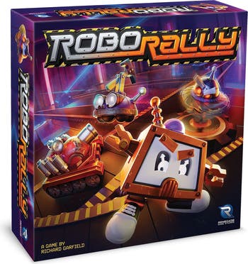 ROBO RALLY - Gentle-Robots... Start Your Microprocessors! If you thought that factory robots took the weekend off like you do (well, most of you), then you haven’t seen a ROBO RALLY yet. When the supervisors are gone and the cameras have been angled to watch the ceiling, the robots take charge and participate in exciting and deadly race-battles. ROBO RALLY is a competitive racing game full of robotic chaos! Program your robot to tag checkpoints, attach powerful upgrades, and turn this dreary old warehouse into a fabulous fast and frenzied fun factory! Features: Includes 6 pre-painted robot miniatures! Over 80 different possible race course possibilities! Includes four double-sided factory gameboards, and thirteen pre-made race courses. Options for short or long races, starter through advanced courses, and variants for play!