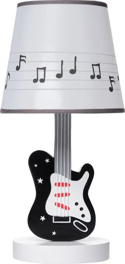 This custom sculpted hand-painted lamp is made of 3-dimensional resin guitar. The total height of the lamp and shade is 14 ½”. This unique detailed black and white guitar will add a soft glow to your child’s room. Musical notes for the guitar are printed on the custom lamp shade. The lamp comes with an energy efficient light bulb (equivalent to 60 watts) and uses less energy. It has a two-year warranty.