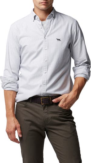 Crisp pinstripes and a classic button-down collar style a wardrobe-staple sport shirt styled handsomely from crisp cotton oxford cloth.
