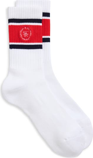 Varsity stripes lend a sporty kick to cotton-blend crew socks with embroidered branding that centers health and wellness.