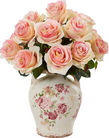 Beautify your home with this artificial arrangement showcasing a collection of realistic silk roses complemented with dark, lifelike leaves. Beautifully displayed in a floral print jar, this 16” tall feminine accent would look lovely on a bedroom dresser.