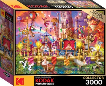 ROSEART: KODAK PREMIUM - MAGIC CIRCUS PARADE - 3000 PIECE PUZZLE - Step into a world of enchantment with Kodak Premium 3000 piece jigsaw puzzles, showcasing the mesmerizing "Magic Circus Parade" by Ciro Marchetti. Embark on a whimsical journey filled with fantastical creatures, clowns, and acrobats aboard a magical circus train. These puzzles epitomize the pinnacle of brightness, richness, and color vibrancy, ensuring an immersive puzzling experience like no other. Crafted with meticulous attention to detail, each puzzle piece is mounted on European premium puzzle board, exuding unparalleled quality and durability. Feel the satisfying weight of each piece as you navigate through the intricate design, experiencing the seamless interlocking and the delightful "snap" that accompanies every placement. Upon completion, marvel at your masterpiece, measuring an impressive 42" x 30", a testament to your dedication and skill. Perfect for gifting, these puzzles offer an exceptional opportunity to bond with friends and family, fostering moments of joy, laughter, and camaraderie. Plus, each puzzle includes a bonus poster, serving as a valuable reference guide to aid in the assembly process and enhance your puzzling journey. Treat yourself or a loved one to the magic of puzzling with Kodak Premium today!