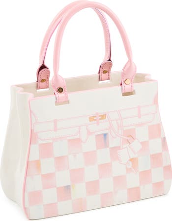 A playful vase shaped like a classic handbag and patterned with pink-and-white checks perfectly displays your favorite florals at your table or mantle. The water-resistant patent-leather straps make the perfect finishing touch to this fabulous decoration.
