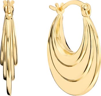 Dimensional tiers create layered shine for hoop earrings plated in 14-karat gold.