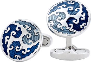 The calming and powerful sense of the ocean is captured on these unique cufflinks. Transparent blue enamel is laid atop silver tone rolling waves. These cufflinks are designed for the water lover at heart.