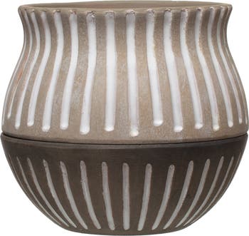 - This hand-painted terra-cotta planter has a grey and beige color scheme that creates a neutral and elegant look and a debossed line pattern that adds texture and depth to the space