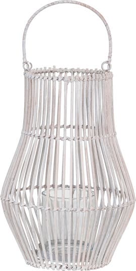 - Exquisite hand-woven wood lantern complete with metal handle and glass insert, and finished in a captivating, whitewashed hue