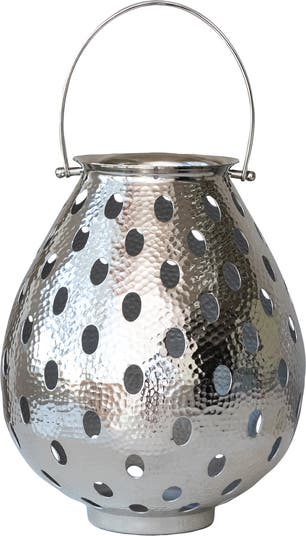 - An elegant metal candleholder lantern featuring a nickel finish with intricate cut-outs and a handle