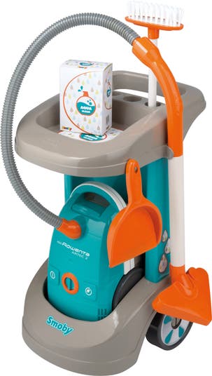 "The Smoby Rowenta Cleaning Trolley with Vacuum Cleaner is the perfect toy for the "little cleaner" in your house. Like a real cleaner your little one can sweep and dust. The electronic vacuum makes real sounds, 2 AA batteries are required but not included. Accessories include electronic vacuum, broom, dustpan and pretend laundry soap box. Designed for ages 3 years and up. WARNING: CHOKING HAZARD Small parts. Not for children under 3 yrs. Some assembly required."