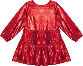 Add a pop of festive flair to her wardrobe with the Ruby Red dress. This metallic red beauty dazzles with long sleeves, a fitted bodice, and a tiered skirt for extra twirl-worthy charm. Perfect for parties or special occasions, this radiant design brings sophistication and fun together in one standout piece. Fabric Content Care 87% POLYESTER 13% SPANDEX Machine Wash Cold | Line Dry | Do Not Bleach