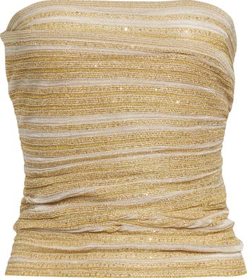 The Italian fashion house introduces another metallic masterpiece to its arsenal with this stretchy tube top shaped with artfully placed ruching