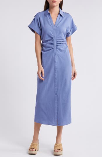 Elegant ruching defines the waist of a refined shirtdress built with clean lines and simple details to offer minimalist charm.