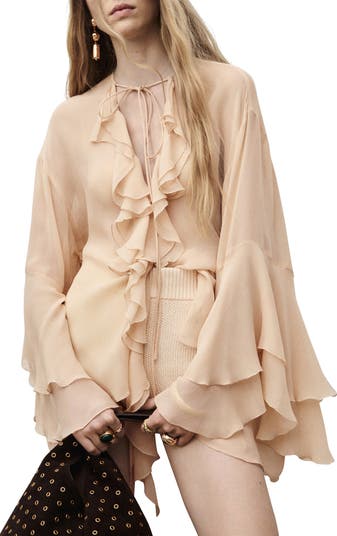 Floaty ruffles add graceful movement to this airy ethereal top framed by flouncy bell sleeves.