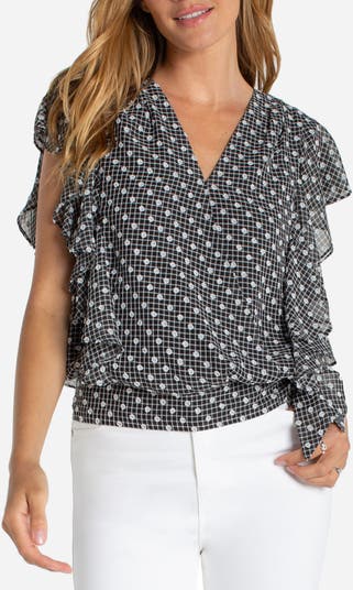 Made of a textured dobby with dimensional blooms and a plaid pattern, this tie-side top has bold ruffles and a smocked hem.