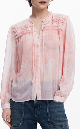 Shimmering metallic threads elevate this blousy lightweight top accented with fanciful frills for texture and charm.