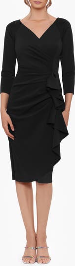 A ruched bodice and cascading side ruffle add a bit more drama to a scene-stealing scuba-knit sheath dress.