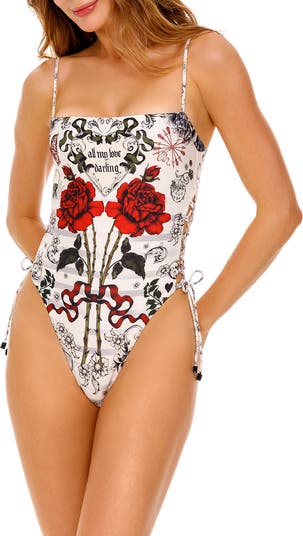 Lounge by the water in this printed one-piece swimsuit secured by lace-up sides with bead-tipped ties featuring handmade details.
