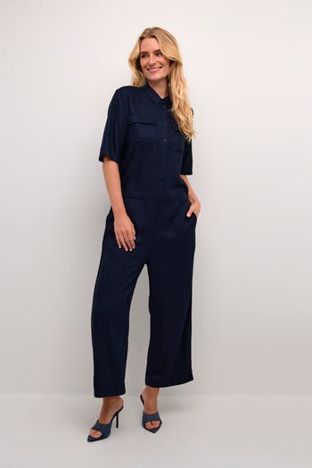 The ruthie jumpsuit will instantly give you an effortlessly cool look. It has a spread collar and buttons down to the elastic waistline. The sleeves are half-length with a loose fit, and the jumpsuit has patch chest pockets and seamed side pockets. The legs are cropped at the ankles and have a wide fit.