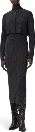 Cable stitching adds subtle texture and sophistication to this matching set featuring a classic cardigan and mock-neck sleeveless dress.
