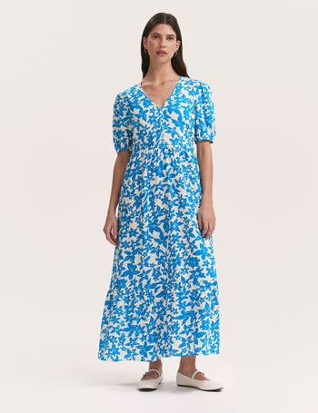 A flattering shape for every figure, Sabine is a relaxed fit floral tiered midi dress with a v-neck, button-down bodice and short puff sleeves.