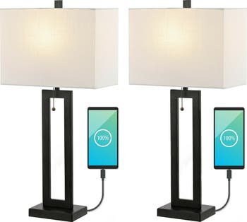 A sleek metal finish and square linen shades give this pair of lamps a clean, modern look. Perfect for resort and office interiors, each lamp includes a USB port and LED bulb for bright, warm light. Use these geometric lamps to add understated style to a bedroom, living room, or entry console.