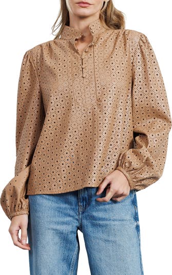Sweet style meets modern edge in this faux-leather shirt featuring gathered shoulders and delightfully dainty floral cutouts.