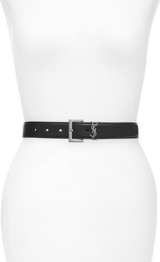 A sleek buckle and YSL monogram keeper cinch the chic look of this Italian belt made from calfskin leather.