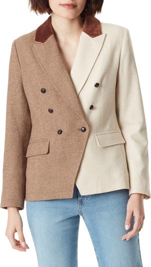 Sharp peaked lapels and a cutaway silhouette add tailored style to this coloblocked blazer featuring a corduroy collar and a chic double-breasted closure.
