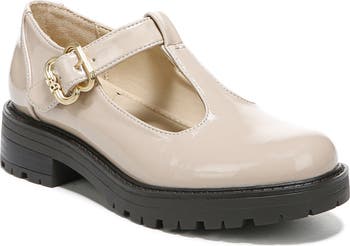 This leather T-strap shoe with glinting hardware and a durable sole is a perfect choice for school days and fancier occasions alike.