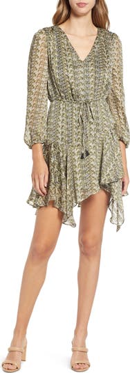A narrow tasseled drawstring adds to the playful movement of the ruffled handkerchief hem finishing this minidress covered with a pattern of frothy bubbles.
