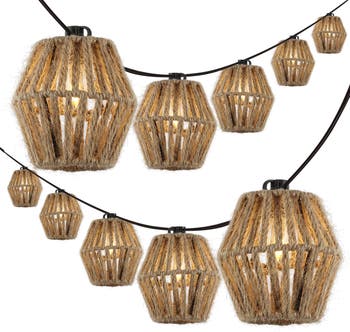 Add mid-century lighting to your patio, deck or balcony with our classic lantern-shade outdoor string lights. Each has 10 lights spaced 12" apart along a 10 cord, and lantern shades woven with real jute fibers. Leave them up at the coastal cottage for entertaining outside, or keep them up all year in mild climates.