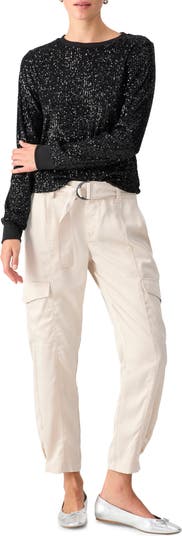 Lustrous sequins elevate this day-to-night top designed with a ribbed neckline and cuffs.