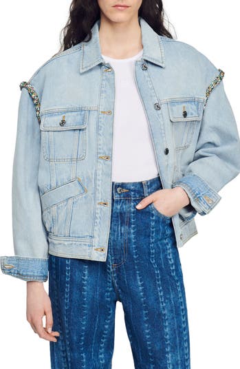 Dazzling rhinestones in an array of jewel tones climb the shoulders of a modern denim jacket fixed with adjustable button waist tabs for a custom fit.