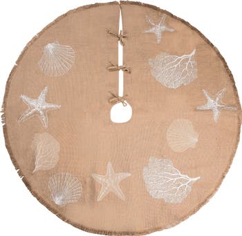 - Bring a touch of coastal charm to your holiday décor with this Sandy Coast tree skirt, showcasing starfish, shells, and coral patterns in rustic brown tones. Made of 100% polyester, this tree skirt combines durability with a soft decorative appeal. A versatile addition to your winter décor, this 54-inch skirt fits most standard tree sizes. It neatly conceals tree stands, helps collect fallen needles, and enhances your home’s festive presentation. The neutral brown palette and coastal-inspired accents pair effortlessly with ornaments, garlands, and holiday lights. Its adaptable design blends well with rustic, nautical, or seaside-inspired themes, creating a cohesive, stylish Christmas display.