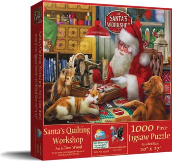 Get into the festive spirit with the Santa s Quilting Workshop 1000 Piece Jigsaw Puzzle by SunsOut Inc. This engaging puzzle, with enchanting artwork by Tom Wood, features a captivating scene of Santa busily crafting quilts, surrounded by a host of adorable animals. The completed puzzle measures a sizeable 20" x 27" and is perfect for any jigsaw enthusiast looking to immerse themselves in the magic of Christmas. The puzzle s high-quality, interlocking design promises secure fitting pieces that minimize frustration, and its eco-friendly craftsmanship provides a gift that values fun and sustainability. Manufactured in the USA using soy-based inks and recycled board, SunsOut puzzles are an environmentally conscious gift that leaves a minimal ecological footprint. This jigsaw puzzle is completed with fully licensed artwork held in vibrant full-color display boxes that make it an excellent gift or a personal treasure to cherish. SunsOut s commitment to quality ensures that if any pieces are missing or damaged, they will resolve the issue quickly and efficiently, letting you enjoy the satisfaction of completing a perfect puzzle stress-free. This isn t just a pastime—it s a cherished holiday tradition, brought to you by a woman-owned small business, adding to the warmth and nostalgia of the festive season. Make the Santa s Quilting Workshop puzzle part of your holiday celebrations this year.