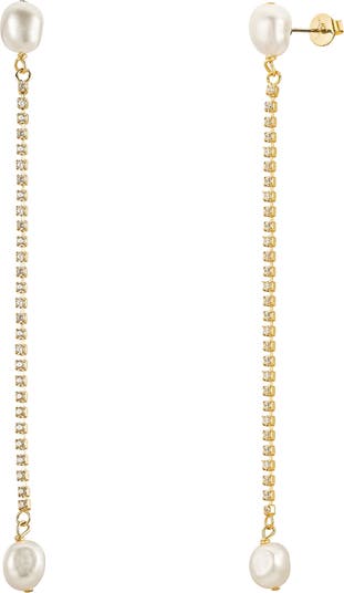 Stunning new freshwater pearl earring featuring a freshwater pearl stud with gold crystal chain and a dangling freshwater pearl at the bottom.
